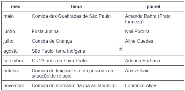 Para o SESC Consolação teve painel no Experimenta com a pergunta: De onde vem a comida brasileira? E para a conversa eu chamei a historiadora Camila Barranca e a Chef e professora Mônica Dias. A gente fechou a unidade literalmente, porque tava bom demais pra parar de falar. E no SESC 14 BIS eu mediei uma cozinha show com duas figuras muito importantes para o Bixiga: a baiana Bá e o Seo Raimundo Nonato. O tema era “A cozinha nordestina no Bixiga: ruas 13 de maio com Santo Antônio” no lançamento do evento Paisagens Postais.